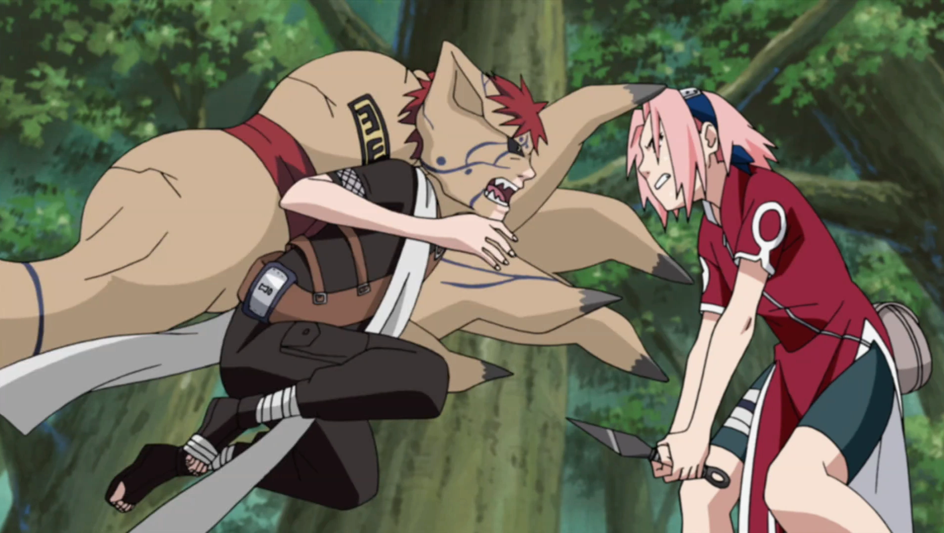 Gaara attacked Sasuke to finish him off, but Sakura stepped in to save him. Gaara didn't understand this move and asked Sakura why she did it. Sakura answered that she did it for Sasuke and Naruto. Gaara, unable to understand this feeling, he who lived only for himself, imprisoned Sakura, unconscious, with a hand of Shukaku made of sand whose embrace closed every moment until it totally suffocated its victim. The only way to prevent this was to defeat Gaara. Sasuke, who was no longer able to fight, asked Naruto to save Sakura by all means. The confrontation between the two jinchuri was also ideological, between the one who believed only in himself and the one who defended friendship. Later, once saved, Sakura went to thank Sasuke for saving her life, but Sasuke admitted to her that he had nothing to do with it and that it was Naruto that she had to thank. When Sakura smiled at Naruto with gratitude, a feeling of jealousy started to develop in Sasuke.