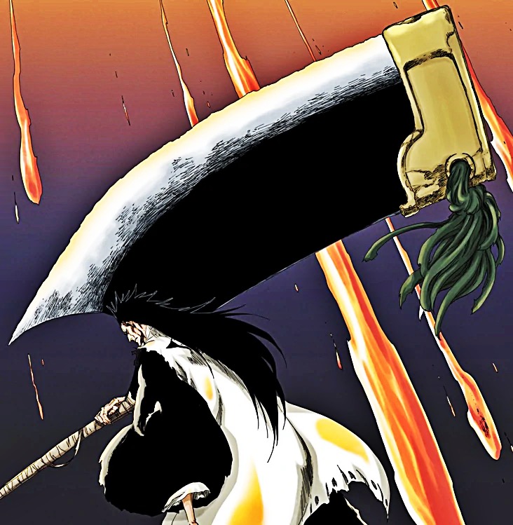 Shikai: Before Kenpachi named his Zanpakutō, people in Soul Society believed that Kenpachi's Spiritual Power was so powerful that it forced his sword to have a constant form. His release command is Avale (呑め, nome). Kenpachi's Shikai takes the form of a huge battle axe, with a cap on top and a green bow on it.