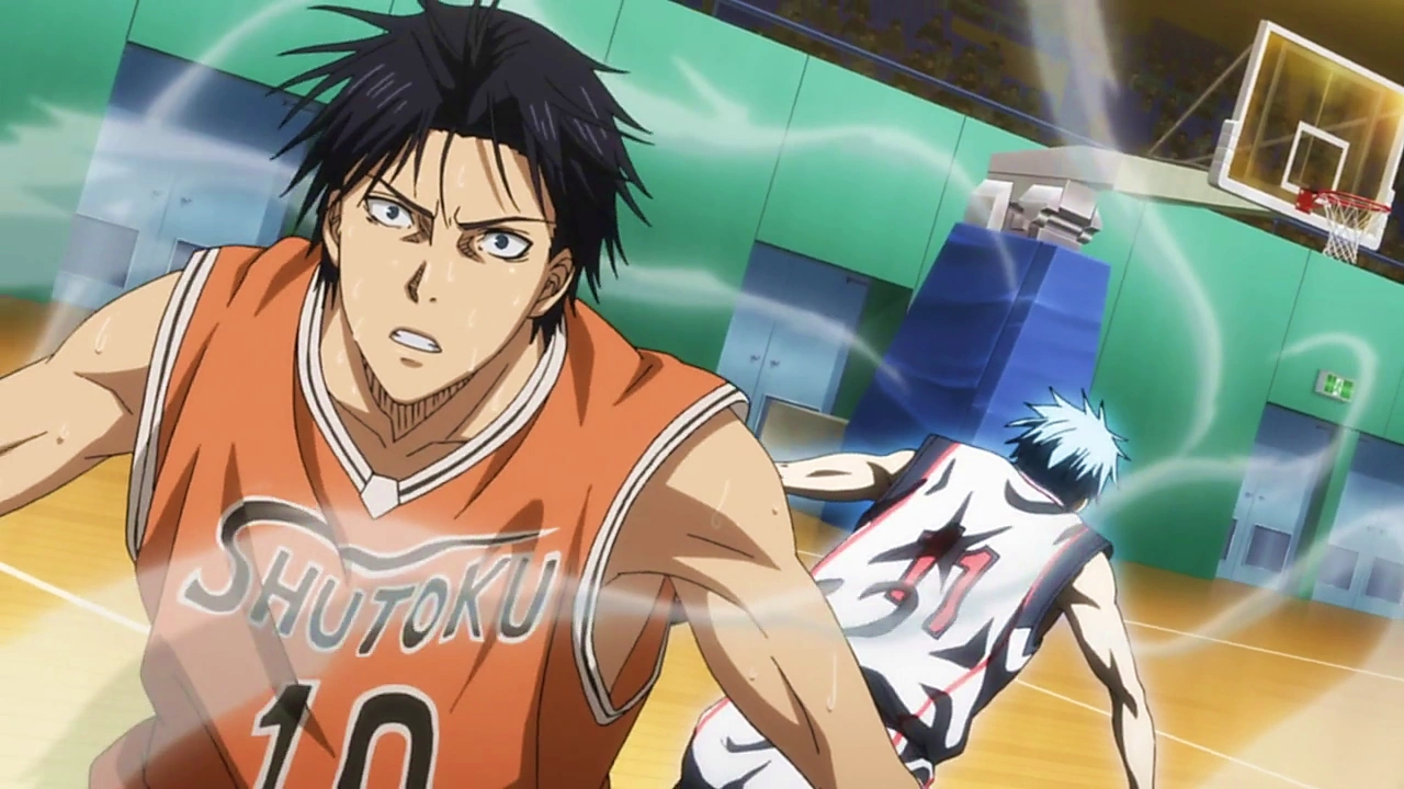 The Shutoku players are surprised that Kuroko comes back now in the game but Midorima tells them that Kuroko would not come back without having something in his sleeve. The game starts again, Kuroko is marked by Takao again. Kuroko moves and manages to escape from Takao by using a screen with Kagami. Kuroko gets the ball back and faces Midorima, using his Vanishing Drive to pass him. Kuroko defeats Midorima and passes the ball to Kiyoshi who scores.