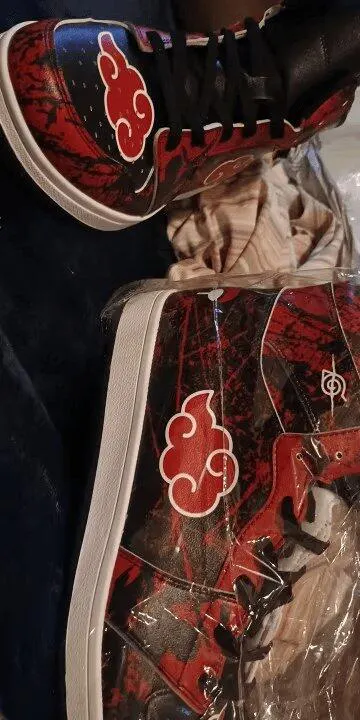 High-top sneakers in the style of Jordan 1 from Akatsuki, a group of rogue ninjas, from the anime Naruto™.